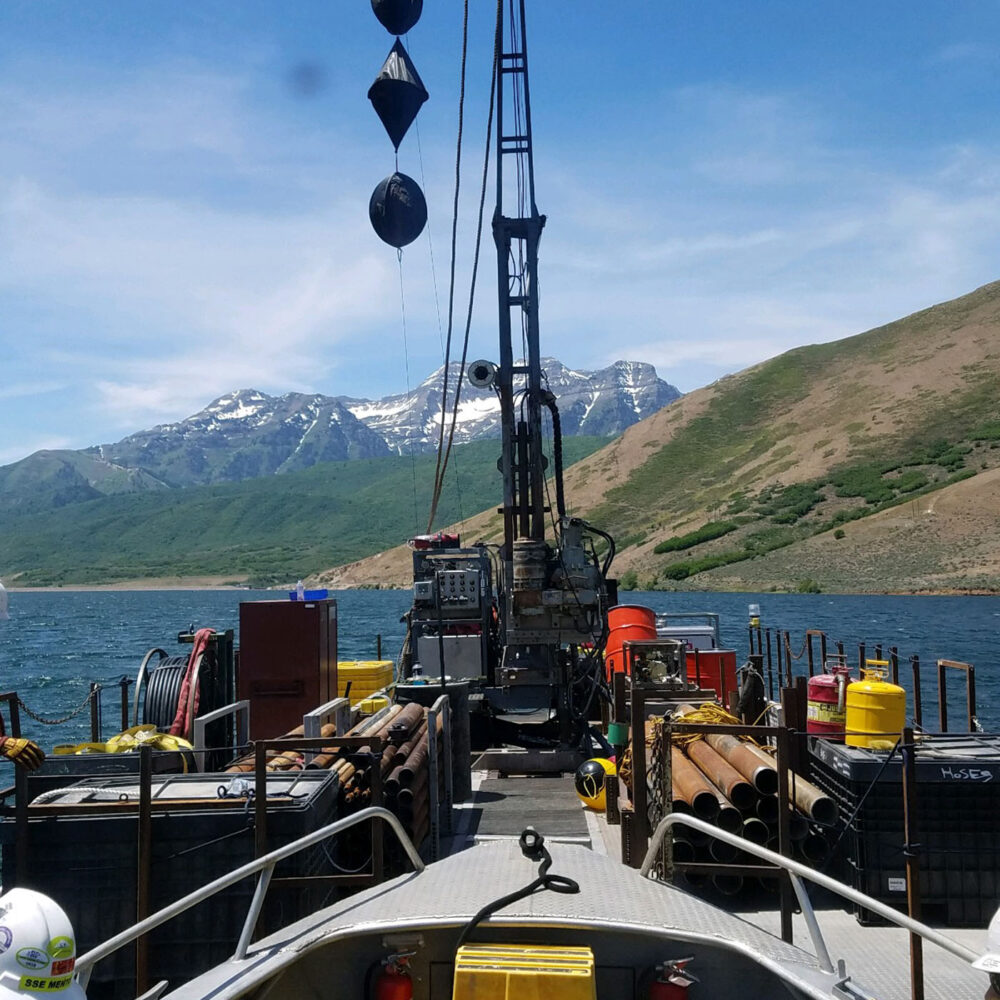 Twelve overwater borings were drilled in water depths ranging from 5 to 135 feet. Crux utilized a custom barge setup to access, mitigating the challenges associated with steep underwater slopes by installing a unique anchoring system. Two land anchors were installed into rock just above the water line on the steep side, and two concrete anchors were installed in the deep water on the opposite side of the barge. Borings were drilled to between 21 and 127 feet below the reservoir floor. Surveyors verified coordinates for these borings, which were used to populate an on-board system that could track the position of the barge relative to the boring location in real time. Geophysical and geotechnical in-situ field testing was performed in select boreholes, including acoustic/optical televiewer, caliper, P.S. wave, pressure testing, and packer testing.