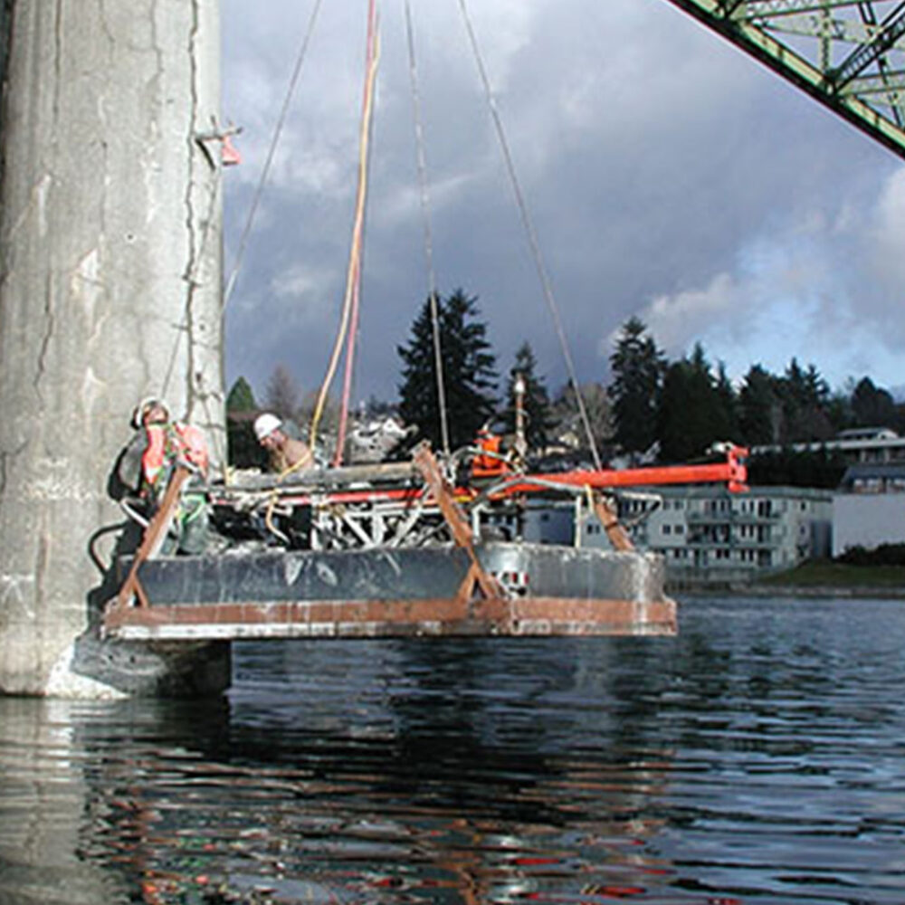 The bridge’s steel structure was supported on 1800-foot long concrete piers, approximately 100 feet above the water surface. As an on-call contractor for WSDOT, Crux drilled three horizontal HQ borings and two, 4-inch masonry holes at various elevations into one of the central piers.